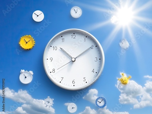 time, clock, watches, sunshine, sky, blue, cloud, daylight, sun, bright, hours, minute, second, day, schedule, appointment, deadline, reminder, agenda, planning, organisation, management, efficiency, productivity, timeliness, punctuality, schedule, timing, moment, fleeting, precious, passing, valuable, measure, rythm, cycle, sequence, succession, measurement, calculation, digital, analog, yellow, white, silver, pastel, floating