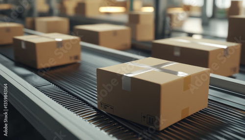 Multiple delivery boxes are transported on a conveyor belt within a large warehouse, highlighting the logistics of package handling and distribution during a busy workday