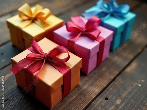 Multiple glossy gift boxes tied with colorful ribbons, aged wood surface, still life, background