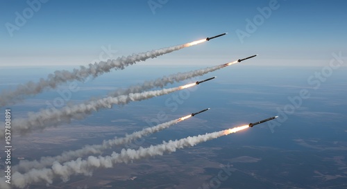 Multiple Missiles Launching into Clear Blue Sky
