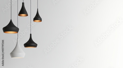 Multiple modern pendant lamps in different shapes and sizes on a white background, creating a clean and minimalist banner design.