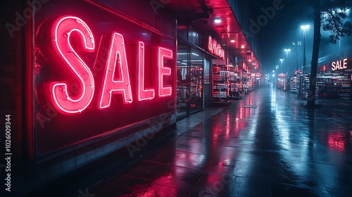 multiple, neon, sale, signs, glowing, deserted, retail, store, dark, environment, reflections, floor, empty, rack, shelf, visible, soft, light, shadow, contrast, modern, design, hd, quality, visual, marketing, promotion, typography, e-business, digital, professional, organised, elegant, festive, vibrant, attention, display, composition