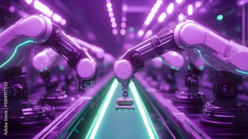 Multiple robotic arms, each with AI-driven cameras scanning food for imperfections in real-time, set in a cyberpunk-inspired factory, neon hues of purple and green, 3D illustration