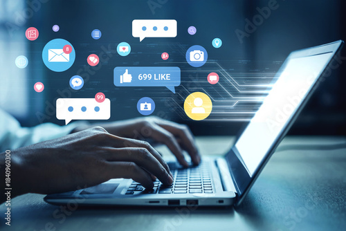 Multiple social media icons, likes, messages, and notifications representing online interaction, engagement, and digital communication Parse