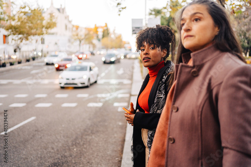woman, pedestrian, friends, street, city, roadside, urban, road, together, asphalt, female, wait, adult, mature, cross, african american, multiracial, warm clothes, black, diverse, lifestyle, contemplate, route, brunette, hispanic, lady, coat, outerwear, style, racked, commute, attentive, traffic, roadway, season, car, autumn, casual attire, fall, outdoors, outside, daytime, daylight, selective focus, blurred background, looking away, horizontal, half face
