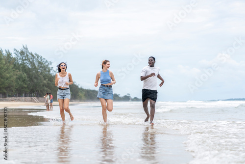 multiracial friends having fun on the beach,enjoy running in seashore together,smiling,laughing,people lifestyle,travel on summer vacations