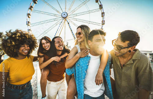 Multiracial friends having fun walking in front of ferris wheel at summer vacation - Friendship concept with guys and girls hanging outside on a sunny day - Summertime holidays life style concept