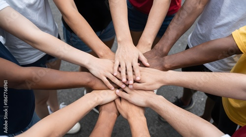 Multiracial group of young people putting their hands together in a show of unity and support