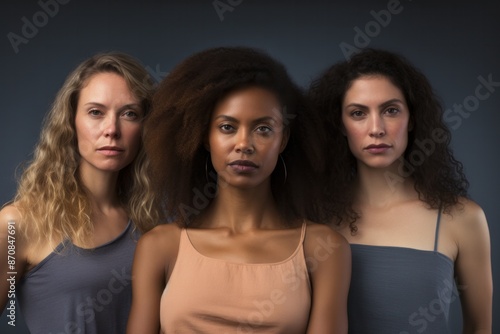 multiracial women in studio looking at camera over grey background