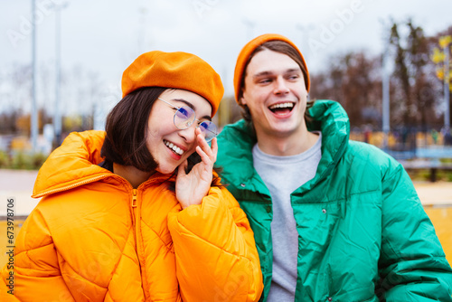 couple, lover, dating, man, woman, asian, caucasian, laugh, love, friends, winter, young, people, happy, meet, teenage, funny, jacket, autumn, friendship, together, youth, college, university, high school, generation, adult, teenage, to sit, student, bonding, social gathering, colourful, clothing, diversity, multiracial, multicultural, outdoors, playground, urban, style, street, city, beautiful, fashionable