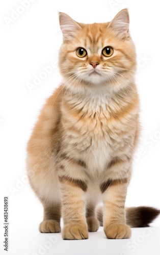 Munchkin Fluffy Cat sitting and looking at the camera in front isolated of white background