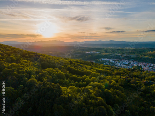 Municipio de Bejar en la provincia de Salamanca a vista de drone desde el cielo durante la puesta de sol