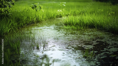 Murky water surrounded by lush green grass in a tranquil rice field within a national park ecosystem