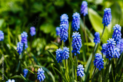 Muscari flowers, Muscari armeniacum, Grape Hyacinths spring flowers blooming in spring. Growing early flowering bulbous plants in the garden