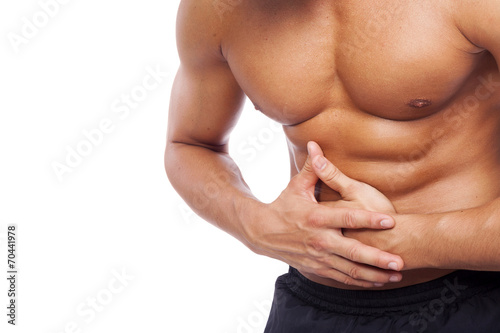 Muscle man with stomach pain, isolated on white