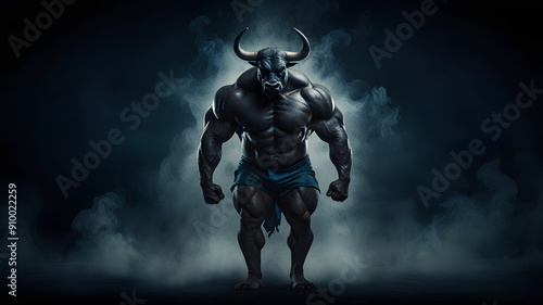 muscular, bull, angry, bodybuilder, dark, background, blue, smoke, fierce, strength, power, cow, athletic, intensity, determination, wild, beast, dramatic, energy, intimidation, physical exercise, primal, black background, athleticism, training, vibrant, animal, wildness, bold, captivating, farm animal, dominance, forceful, determined, muscular, art, aesthetic, creative