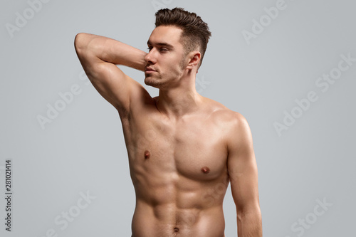bodybuilder, muscular, shirtless, man, strong, young, athlete, fitness, torso, sexy, cool, allure, chest, masculine, abs, physique, confident, body, healthy, male, training, physical exercise, sport, photogenic, strength, power, guy, six-pack, fit, success, gym, brutal, macho, hot, dreamy, grey background, horizontal, studio shot, isolated, looking away, copy space