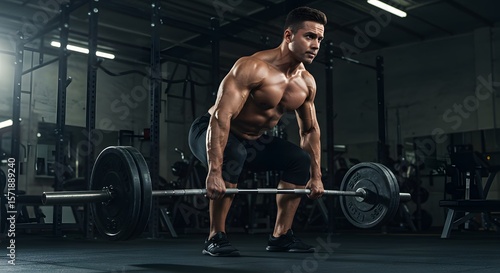Muscular man lifting a barbell in a gym, showcasing strength and fitness.