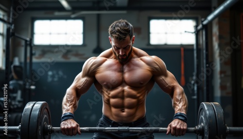 muscular, man, pure, strength, intensity, gritty, gym, setting, lifting, heavy, barbell, bottom, frame, copy, space, available, top, text, branding, ai, generative