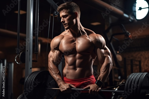 Muscular man working out with weights in the gym. Handsome male exercising with barbells.