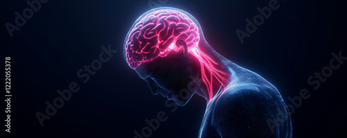 muscular pain suffering concept. Digital representation of a glowing human head with neural connections.