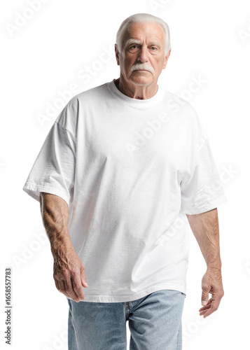 Muscular senior man wearing white oversized t-shirt and blue jeans, isolated on transparent background