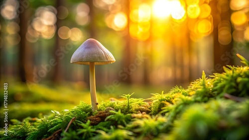 Mushroom in Forest with Moss and Sunlight Creating a Dreamy Atmosphere