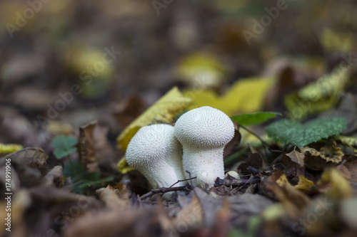 Mushroom puffball in the woods in the fall among the dry twigs, green and yellow fallen leaves. Lycoperdon perlatum known as the common puffball, warted puffball, gem-studded puffball