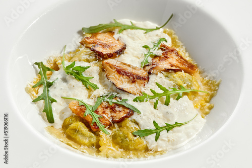 ravioli, mushroom, sauce, pasta, cheese, food, plate, italian, tortellini, cream, white, creamy, parmesan, wild, homemade, cooking, receipe, cookery, mushroom, background, elegant, meal, dinner, dish, vegan, epicure, delicious, lunch, healthy, isolated, eatery, isolated on white, white background, italian food, traditional, arugula