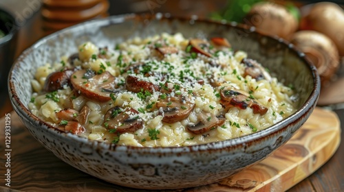 Mushroom risotto topped with parmesan and herbs in a ceramic bowl, AI generated