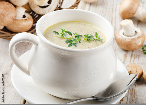 bowl, champignon, classic, cream, creamy, cookery, delicious, diet, dining, dinner, dish, food, fresh, epicure, green, health, healthy, herb, hot, ingredient, liquid, lunch, meal, mushroom, thyme, plant, plate, soup, spice, tasty, traditional, vegetable, warm, white, wood, wooden