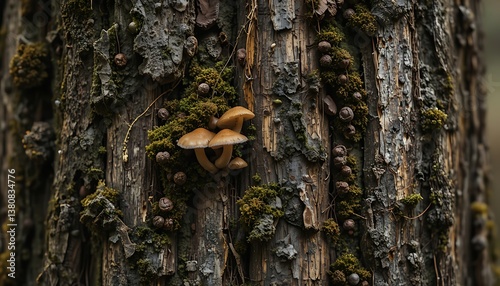 Mushrooms Growing on Tree Trunk with Moss and Unique Texture