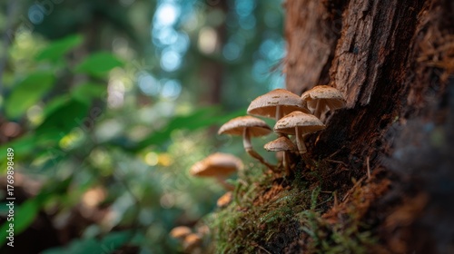 Mushrooms on tree trunk, blurred forest background, sunlight filters through