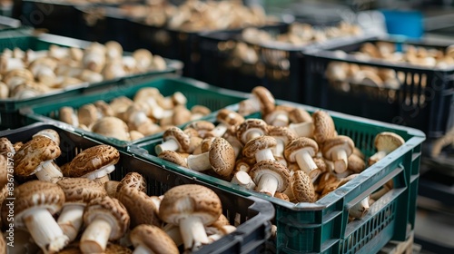 Mushrooms sorted and packed into eco-friendly crates, lined up in a row, ready to be loaded onto a delivery truck