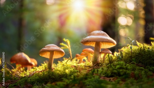 mushrooms thrive on a mossy forest floor in soft sunlight
