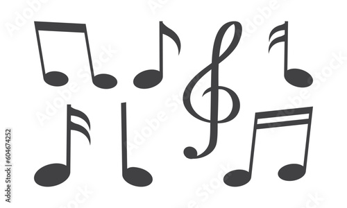 Music note vector pictogram, music key and elements, play piano symbol, melody set, black silhouettes isolated on white background. Media illustration
