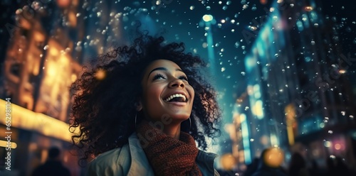 Music open air festival with dancing and cheering audience on fireworks light background. Happy party girl with hands up enjoy and celebrating evening concert.