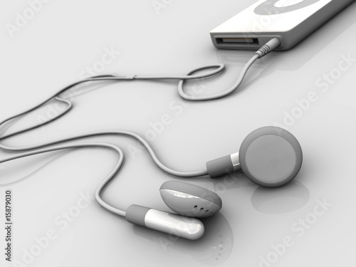Music player with headphones on reflection background