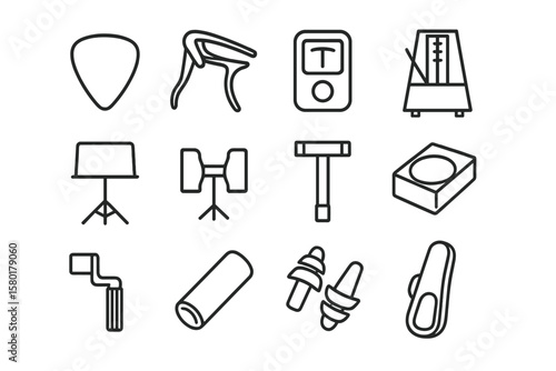 Musical instrument accessories icons featuring various tools and devices