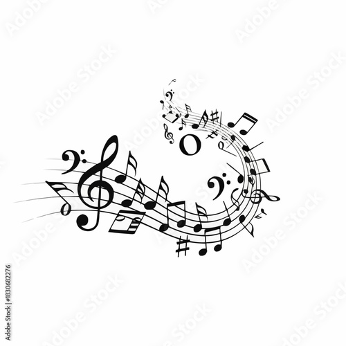 music, note, treble, bass, staff, melody, harmony, rythm, sound, musical, notation, composition, score, art, design, swirl, spiral, flow, dynamic, expression, creative, artistic, symbol, element, illustration, graphic, abstract, concept, idea, performance, entertainment, culture, classical, jazz, pop, rock, song, tune, instrument, orchestra, band, choir, vocal, piano, guitar, drum, fiddle, trumpet