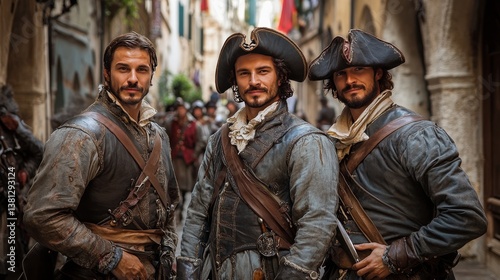 musketeer, france, carnival, costume, friends, uniform, historical, posing, man, soldier, group, europa, traditional, dress, celebration, alley, fashion, street, weapon, sword, hat, leather, guard, warrior, military, reenactment, theatre, performance, actor, festival, crowd, architecture, building, tour tourism, travel, culture, event, entertainment, outdoors, day, looking, portrait, three people, photogenic, smile