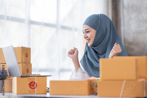 Muslim Young Asian business woman startup sme small business entrepreneur SME distribution warehouse with parcel mail box. Muslim girl SME Online marketing and product packaging and delivery service.