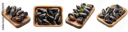 Mussels placed on a wooden tray, isolated on a white background. Mix Collection PNG.
