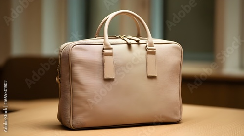 Muted Beige Zipped Document Bag: Angled Top View, Professional, Stylish, Secure Document Storage Solution.