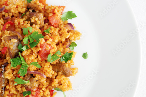 pilaf, mouton, tomatoes, onion, pepper, parsley, wheat, meat, yellow, red, green, fresh, chopped, cooking, food, traditional, turkish, lamb, menu, portion, plate, white, easy, eatery, homemade, hot, main, dish
