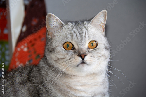 Muzzle of a beautiful gray British cat with amber eyes close-up on a gray background