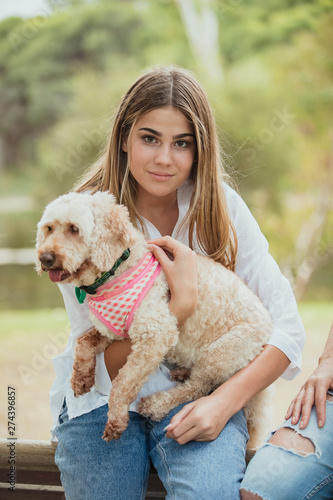 woman, puppy, animal, cute, affectionate, sitting, waist up, relaxation, holding, embracing, togetherness, bonding, care, smiling, happiness, friendship, beauty, domestic animals, enjoyment, innocence, bandana