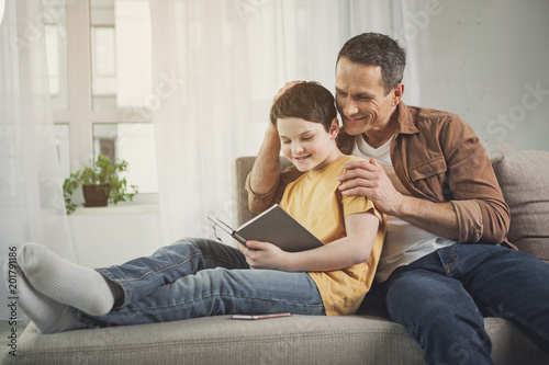 My loving son. Cheerful boy is reading book with interest and smiling. His father is embracing him and stroking his head with fondness