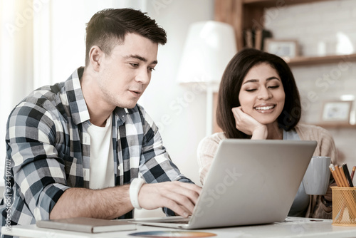 My support. Attentive brunette staring at computer while checking his email