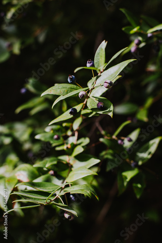 Myrtle branches with dark blue berries in a sunny day.